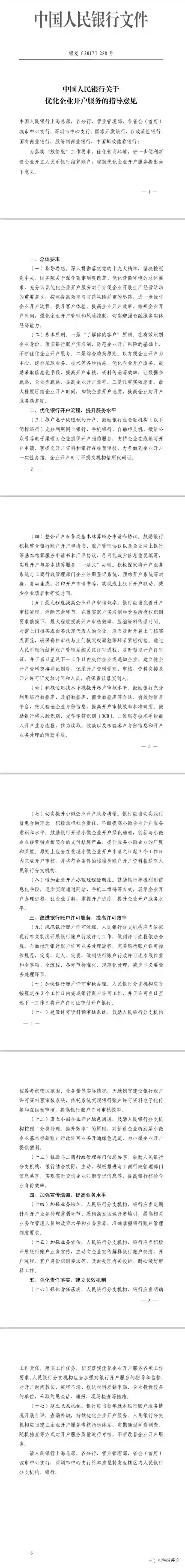 雷锋网AI金融评论报道,中国人民银行近日发布《中国人民银行关于优化企业开户服务的指导意见》(银发〔2017〕288号 ),对新设企业开立人民币银行结算账户服务提出意见。