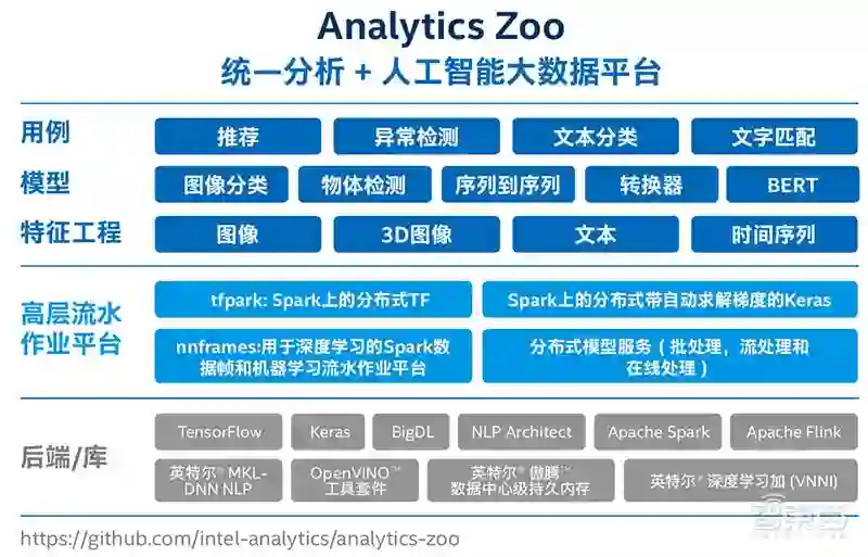 另外,考虑到很多用户需要兼顾大数据分析和AI处理,英特尔将二者无缝集成到一个统一的平台Analytics Zoo中,该平台基于英特尔至强处理器平台,并融合了MKL-DNN等多种软件库,可大幅提升训练和推理速度。