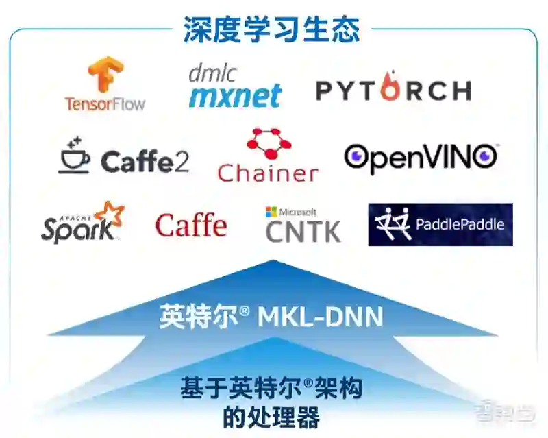 英特尔面向TensorFlow、MXNet、PyTorch、Caffe等主流深度学习框架做了优化,设计了MKL-DNN性能增强库,以提升这些框架在英特尔架构基础设施上的运行速度。
