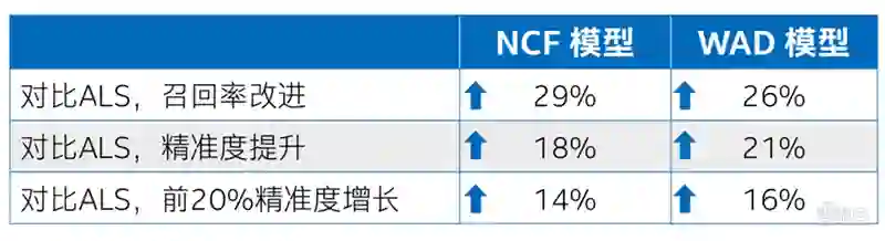 万事达优化推荐服务时用了NCF和WAD模型,从验证结果来看,精准度和召回率均相比ALS模型有明显提升。