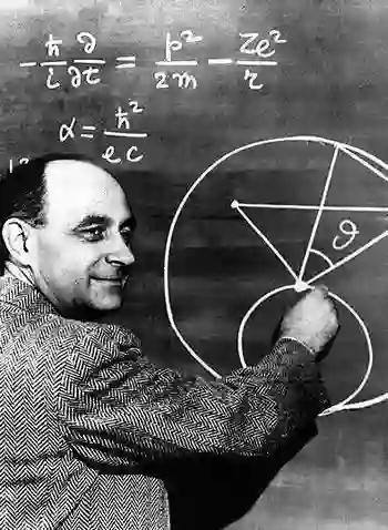 大物理学家恩里科·费米(Enrico Fermi)有一张在黑板前讲课的照片,里面赫然就写着精细结构常数α的表达式。大家仔细一对照就会发现,费米把这个著名的常数写成了!这不是开玩笑吧?谁知道呢!其实写错了也没关系,因为大科学家记不住那些很细节的东西并不罕见,最重要的是他们的科学思想经常超乎常人的想象。但费米是意大利人啊,一般来说,意大利人做事不拘小节,至少不如德国同行那么严谨细心。因此,假如索末菲地下有知的话,也许只能对费米这张流传甚广的照片摇摇头、耸耸肩、摊开手、笑一笑而已。