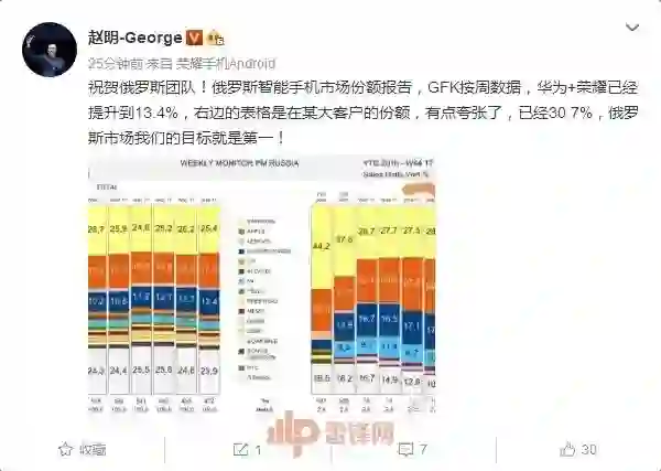荣耀总裁赵明在微博上公布了了华为+荣耀在俄罗斯的手机份额。GFK按周数据显示,华为+荣耀的份额已经提升到13.4%。仅次于三星和苹果,后两者的份额分别是25.4%和17.9%。荣耀总裁赵明表示,华为+荣耀在俄罗斯市场的目标是第一名。