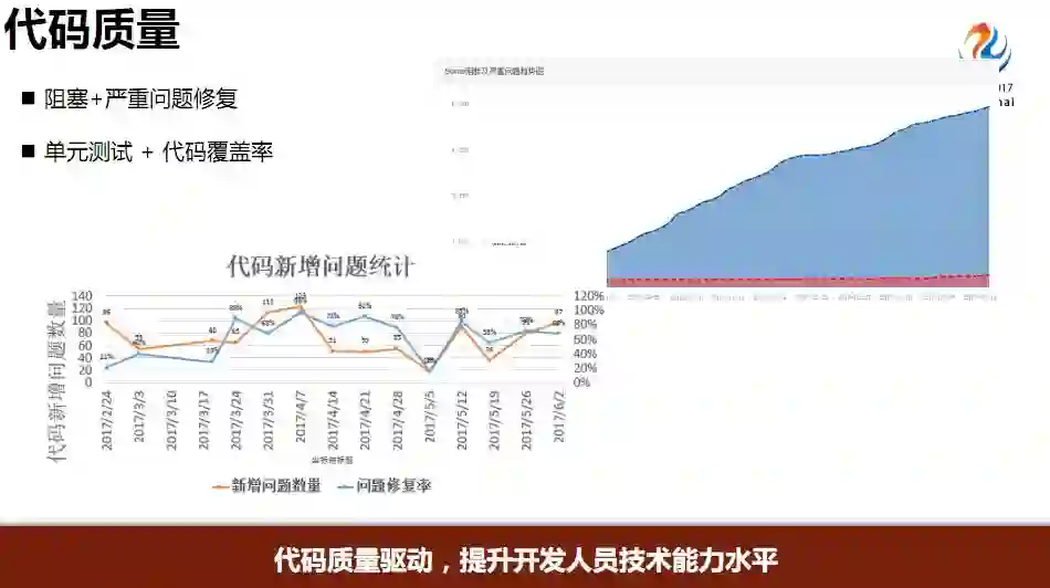 这是2016年4月份的数据,之后就推行代码质量的检查,蓝色是已修复的,红色是未修复的。举这个例子给大家看一下,红色是很少,是一些老的系统,已经要下线的了,我们不会清,但会放在这里。基本上所有新增问题都修掉了。第二个,这个曲线是比较陡的,越来越缓,这是为什么?这是我们研发水平提高了。这是真正研发水平提高了,通过这些数据就可以知道到底是提高了还是降低了。