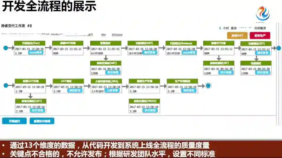 测试,代码检测是因为我们有统一的分支策略,前面第一个分支,到最后测试、上线,其中任何一环达不到标准的话,是不能进行的。