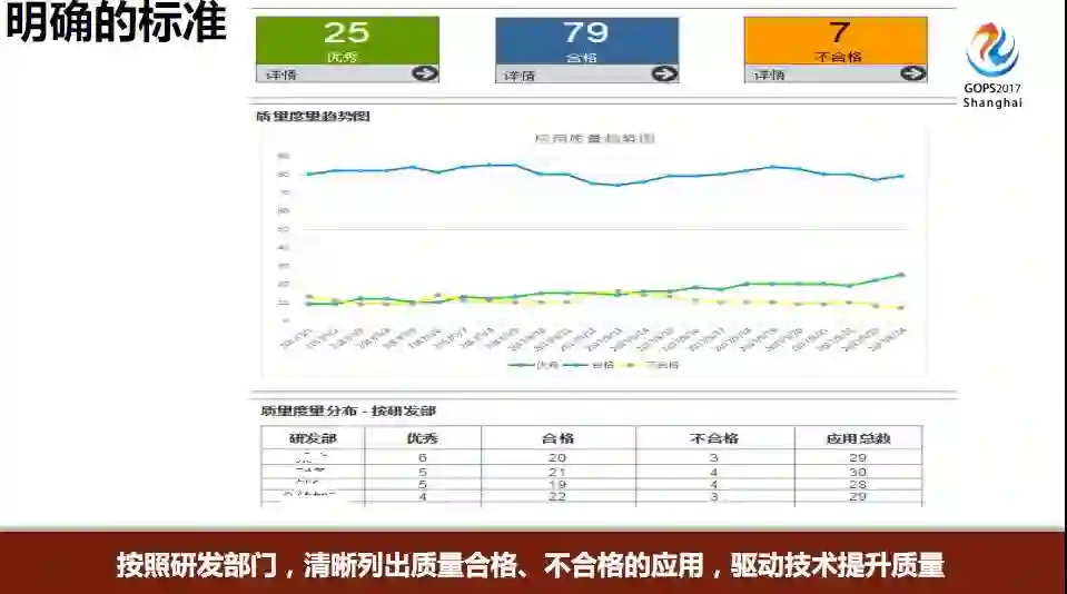 通过这些数据就提供一些标准,这个就是质量度量的界面,大家可以看的很清晰。大家可以清晰的看到每个部门到底有多少应用,应用系统到底是合格还是不合格。质量情况到底怎么样,想度量别人,一定是两个纬度。