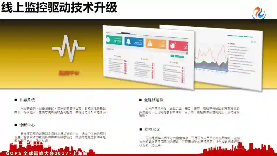 我们也有全链路监控,日志系统是ELK,所有日志都读到ELK里面再进行分级。诊断中心就是看到底是不是问题,不断升级去报警。一开始邮件短信后面就直接自动打电话,告诉你有这个问题。