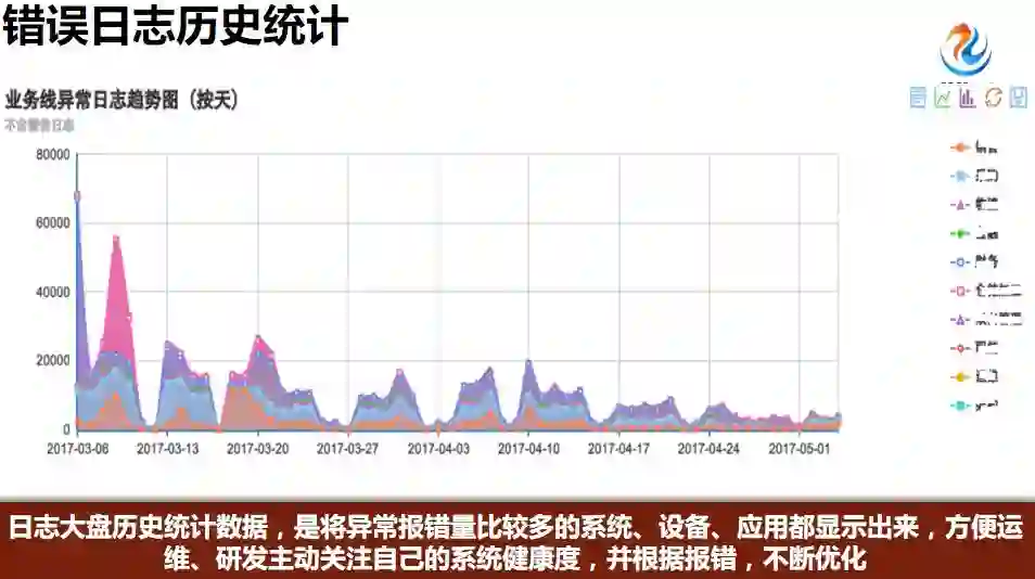 这个是给研发总监的,包括每个系统,各个研发部门,不同颜色标识着各个研发部门。通过技术的考量,通过数据去驱动技术升级,可以看到日志的趋势是明显变缓的,系统是越来越稳定的。