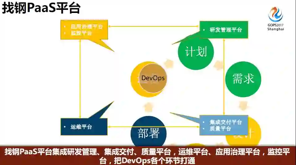 找钢网也会有各种平台,像计划需求、研发管理平台,这块有质量、集成交互平台、运维平台、应用治理,应用治理主要是一些中间件,像SOA、配置中心,监控平台是全链路的监控。我们不仅仅有这些平台,更为关键的是能够全部打通,形成一个端到端的数据,然后拿这些研发数据衡量运维的水平。
