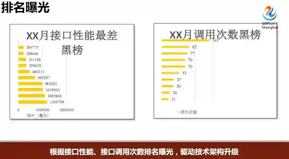 这里做一个统计,让大家知道有没有出事情。例如一天只有一两个没关系,突然之间爆增到一百个以上是要出问题的。我们公司每个研发部门挂了两个大屏专门投这两个东西。这个跟前面一样,慢日志的趋势图。当出现事故的时候,绝对不是突然之间出现,而是有趋向的。我们ELK跟万能钥匙是一样的,后来觉得不够直观,又做了这些东西全部投到大屏上。这是某一月我的汇报数据。这个是我们的调用次数,一个月调用了21次的API到底设计合不合理,耦合度到底强不强。这些数据其实都是很有参考价值的,经过我们的推动,我们整体架构有了质的升级。