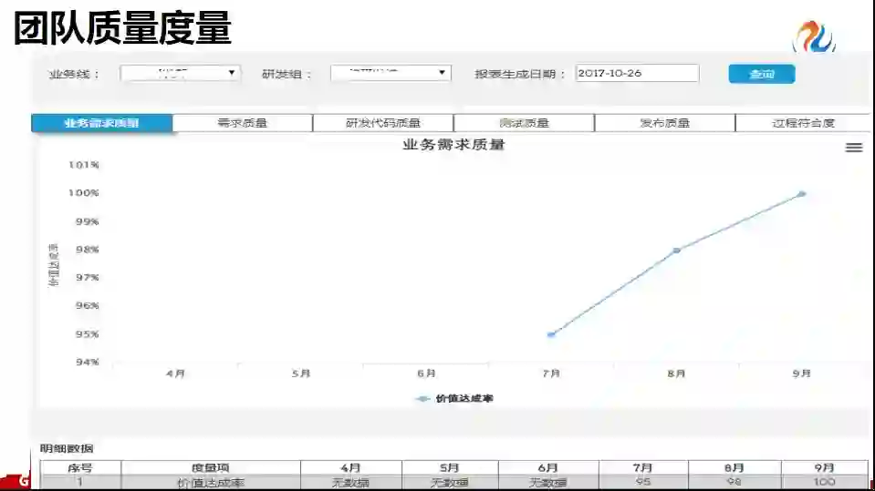 需求值是否充分,如果产品和研发部在一个部门的话,产品和研发永远是天地,总是相互打架。这个需求值就是说整个研发团队,收到的需求到底充不充分。能够度量团队到底饱不饱和,是否需要加人,不饱和是否给他多做一些培训。或者说长期不饱和的话,有的资源是否要调出,这仅是一个参考值。
