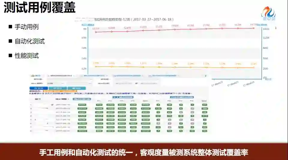 这个会统一管理自动化手工测试包括智能测试,这样能清晰地体现一个功能上线到底覆盖了什么东西。之前有一个痛点,自动化跟手工是分离的。自动化跑完了不知道功能覆盖了多少,后来经过这个平台就有一个非常统一的度量,功能点覆盖了多少。有数据就一定有排名,这是为什么能够驱动研发改进他架构跟技术。这个研发经理会不会紧张?这个研发管理一定出了问题,是研发不够重视,是资源不够还是测试出了问题,这是需要注意的。