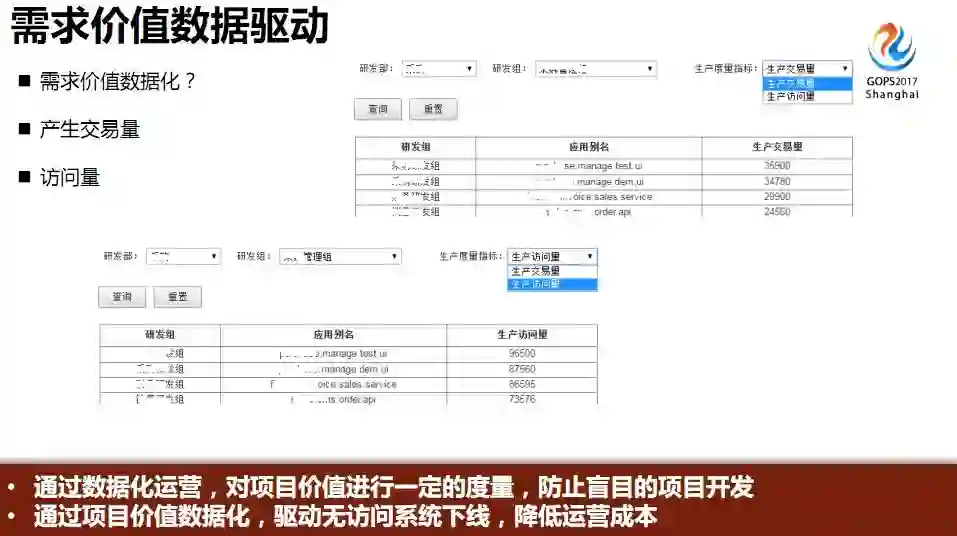 这个我们就提供度量,首先价值度量,是不是所有的价值都能够数据化呢?这个是值得商榷的一件事情,因为像有些技术改造或者说短期内是看不到价值的,我们尽量会数据化,主要包括产生的交易量和系统的访问量,用来达到两个目的: