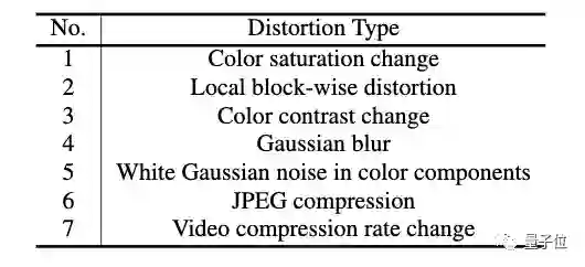 具体而言,就是在视频中加入色彩饱和度变化、局部图像块失真、色彩对比变化、高斯模糊、色彩分量中的高斯白噪声、JPEG压缩和视频压缩率变化这七种失真。