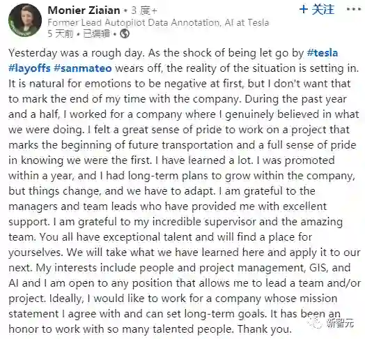 已经是特斯拉「前」自动驾驶数据统计与人工智能主管 Monier Ziain在帖子中表示,「能与这么多才华横溢的人共事是一种荣幸」。