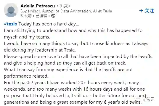 来听点有意思的,特斯拉一些被裁的员工在领英发帖称「尽管他们被特斯拉解雇了,但他们赞同马斯克对电动汽车的未来规划,并很荣幸为之而努力」。