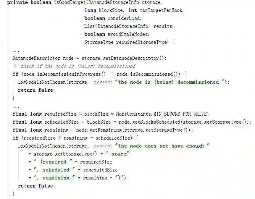 在BlockPlacementPolicyDefault.java中的isGoodTarget定义了选取Datanode节点策略,其中有两项是“节点是否在下线”、“是否有足够存储空间”,如果不可用数量过多,则可能导致选择不到健康的Datanode,因此,必须保证一定数量的健康Datanode。