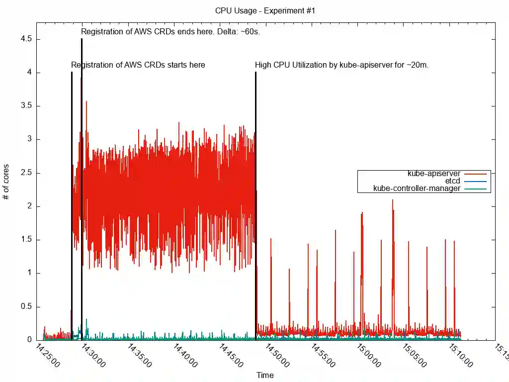 在创建了 765 个 AWS CRD 之后,紧接下来的一段时间 CPU 利用率非常高。