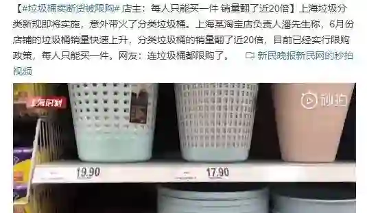 垃圾分类制造的焦虑,成功让上海的垃圾桶都卖到限购。以往9块9就能包邮的垃圾桶,现在身家翻倍,还仍被买断货。上海人都想一口气买了四个垃圾桶,先在家里做好分类。