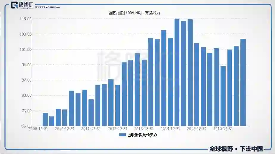 由于行业的发展,但凡是个好好做业务的公司,营收、应收都是在增长的,比绝对值是没意义的,所以还是看应收账款周转天数是比较好的纵向衡量指标,回看行业的绝对龙头:国药控股(1099.HK)这些年的应收账款周转天数,前期一直在放大,符合从优势区域到普通区域扩张,放大账期来拉动营收的节奏,在2015年到顶后逐步下滑,但是在2017年又迅速的提高,符合“两票制”让增加账期的节奏。