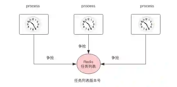 会有多个进程,每个进程都会管理时间,时间到了就使用数据库锁来争抢任务执行权,抢到的进程就获得了任务执行的机会,然后就开始执行任务,这样就解决了 Master 的单点问题。