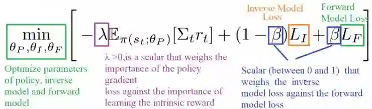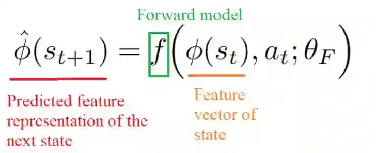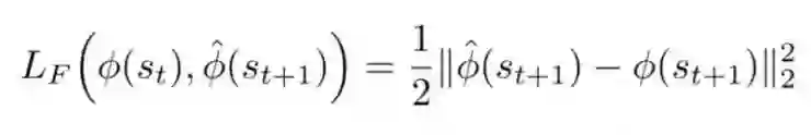 我们知道可以将好奇心定义为给定当前状态st和行动at的预测新状态(st + 1)与真实新状态之间的误差。