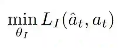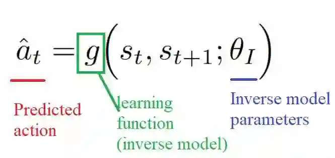 要学习这个特征空间:我们使用自我监督,在智能体逆向动态任务上训练神经网络,给定其当前状态和下一个状态(st和st + 1)预测学习体行为(ât)。