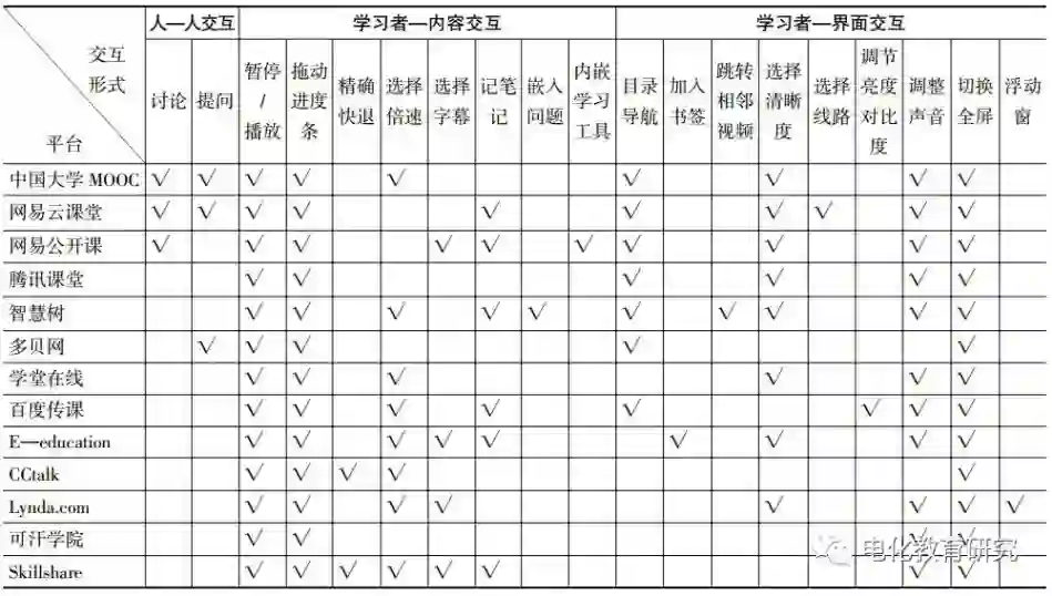 总之,在线开放课程的交互研究涵盖广泛,本研究是在前人研究的基础之上对在线开放课程的交互设计进行总结和梳理,并提出一些发展的建议。在未来的研究和探索中,还需相关研究人员、技术人员的共同努力,以提升学习效果为宗旨,为在线开放课程的交互研究贡献力量。