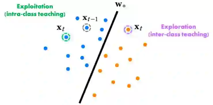 在 exploration 的教学场景下,teacher 会会推荐跟 xt-1 特征非常接近的教学样本 xt。因为不同类型(class)的但是特征(feature)非常接近的样本可能会有比较有代表性,从而有较高的教学有效性。