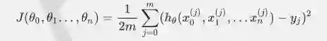 比如对于线性回归,假设函数表示为hθ(x1,x2…xn)=θ0+θ1x1+..+θnxn,其中wi(i=0,1,2...n)为模型参数,xi(i=0,1,2...n)为每个样本的n个特征值。这个表示可以简化,我们增加一个特征x0=1,这样h(xo,x1,.…xn)=θ0x0+θ1x1+..+θnxn。同样是线性回归,对应于上面的假设函数,损失函数为(此处在损失函数之前加上1/2m,主要是为了修正SSE让计算公式结果更加美观,实际上损失函数取MSE或SSE均可,二者对于一个给定样本而言只相差一个固定数值):