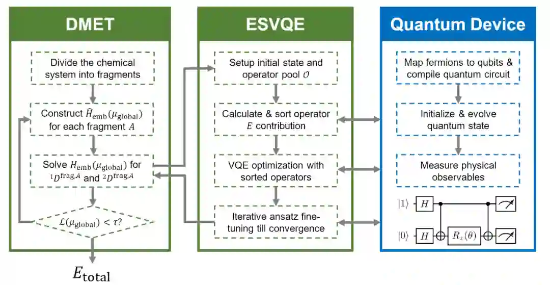 针对这一问题,字节跳动 AI Lab Research 团队联合清华大学化学系帅志刚课题组、中科院计算所孙晓明课题组、北京大学袁骁课题组和牛津大学孙金钊博士提出了利用密度矩阵嵌入理论 (Density Matrix Embedding Theory, DMET) 结合能量排序 VQE (energy-sorting VQE, ESVQE),减少分子体系模拟所需要的比特数和线路深度,