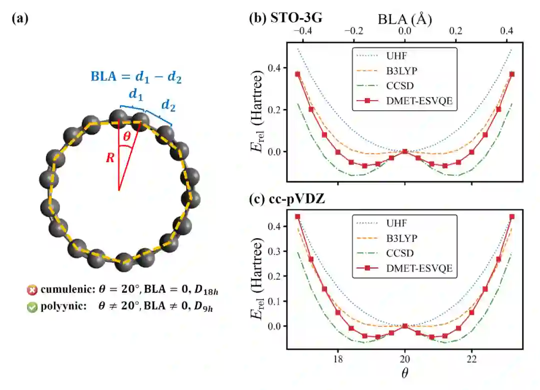 随后,作者将该算法应用于 C6H8 的氢化反应和 C18 分子的平衡几何结构。数值测试发现 DMET-ESVQE 可以高精度地模拟化学反应势垒,且正确预言 C18 分子的平衡几何结构,与此同时, DMET-ESVQE 可以将 VQE 所需的量子比特数目减少一个数量级。