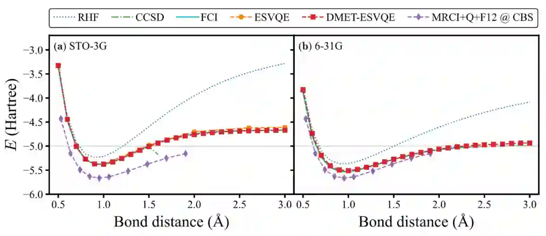 为验证这一算法的有效性,作者进行了一系列数值模拟测试。首先,在一维氢链 H10 的基准测试体系中,作者发现 DMET-ESVQE 可以达到与精确解 Full CI 相仿的精度。