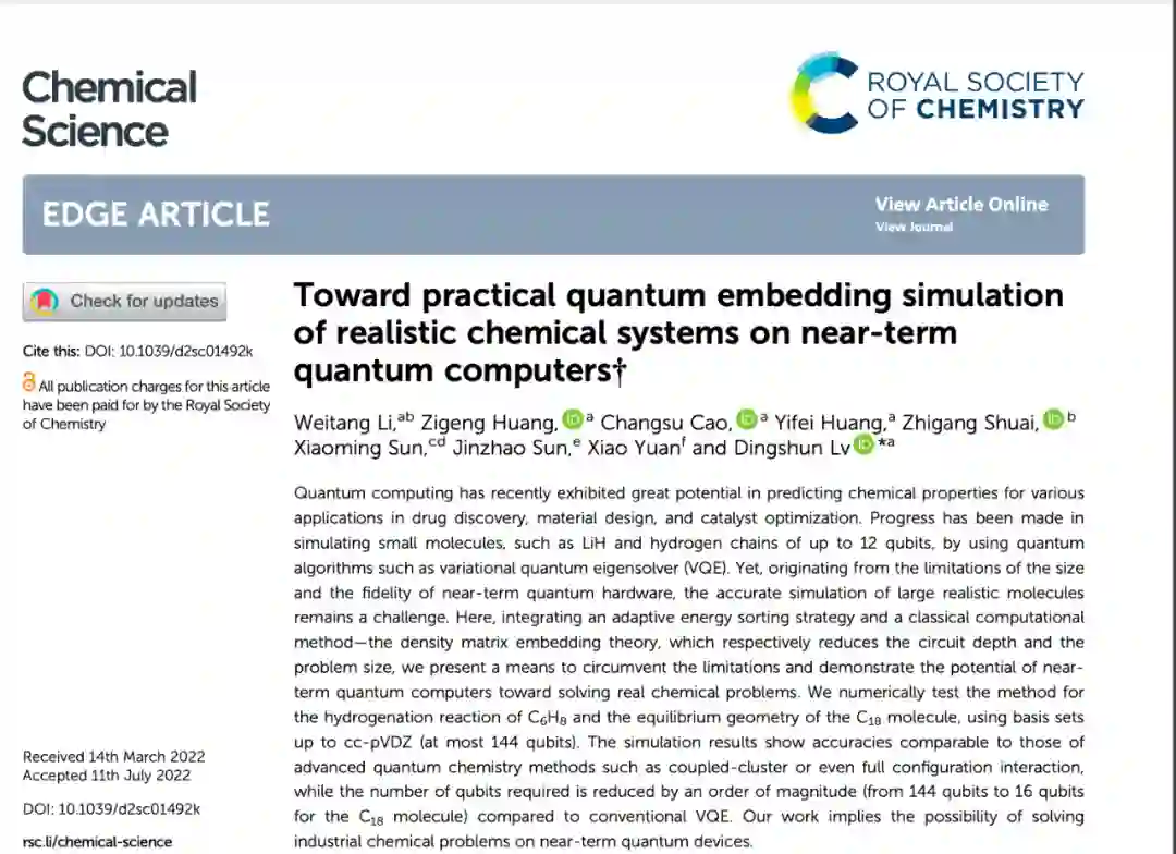 化学、材料体系的模拟很可能会成为量子计算机最先颠覆的行业。变分量子特征值求解算法 (variational quantum eigensolver, VQE) 在近期含噪声中等规模器件上表现出应用于化学模拟的巨大潜力。2020 年,Google 公司利用 “悬铃木” 量子芯片实现了二亚胺 (N2H2) 异构化反应过程的量子计算,相关成果发表于《Science》杂志。然而,近期可实现的量子硬件的尺寸和保真度仍然面临着明显的限制,这对利用量子计算机模拟更加真实的化学、材料体系提出了挑战。