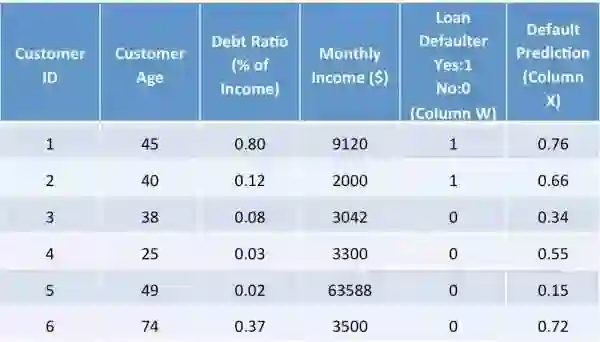 为了使事情变得简单明了,让我们可以用一个简单的示例来帮助理解ANN:一家银行想评估是否批准一个客户的贷款申请,所以,它想要预测这个客户是否可能违约贷款。现在,它有如下数据: