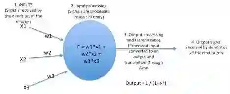 在我们的大脑中,有数十亿个称为神经元的细胞,它们以电信号的形式处理信息。神经元的树突接收来自外部的信息或刺激,并在神经元细胞体进行处理,将其转化为输出并通过轴突传到下一个神经元。下一个神经元可以选择接受或拒绝它,这主要取决于信号的强度。