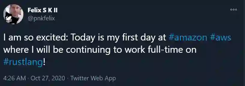 Felix Klock 主要致力于 Rust 编译器、运行时库和语言设计相关工作。在入职 AWS 之前,他是 Mozilla(开发 Firefox 浏览器的公司)的一名研究工程师。2010 年,他在美国东北大学拿到了计算机科学博士学位。同年 3 月,他加入了 Adobe 担任计算机科学家,致力于 ActionScript 虚拟机的开发。2012 年,Klock 离开 Adobe,加入 Mozilla。今年 8 月,Mozilla 宣布进行大裁员,Felix Klock 也在这个月离职。今年 10 月份,Klock 宣布自己加入 AWS,继续全职开发 Rust。