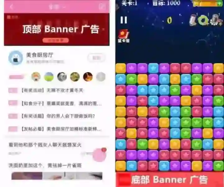 大多数平台都有 Banner 广告;一般纯工具类 APP(天气、游戏、翻译、阅读等)使用底部 Banner 较常见。