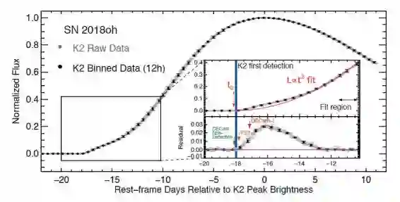 2018年 2月,借助开普勒望远镜(K2),天文学家观测到了 Ia型超新星 2018oh爆发前、爆发开始时以及爆发过程中的光变曲线(图 3)。这是人类第一次如此完整地记录了一颗超新星的爆发过程。借助这次观测,天文学家能改进 Ia 型超新星的物理模型。由于Ia型超新星是宇宙学中重要的标准烛光,更好的物理模型也将改进对宇宙膨胀速率的估计。