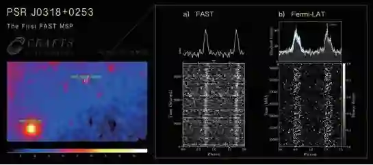 2018 年初,FAST 望远镜在对一个 Fermi 望远镜发现的伽马射线点源的观测中发现了脉冲星信号。基于FAST 发现的周期对 Fermi 望远镜之前的数据进行折叠,证实了这个点源是一颗毫秒脉冲星。图 5为新发现的毫秒脉冲星 PSR J0318+0253位置和积分脉冲轮廓,左为 PSR J0318+0253所在伽马射线巡天图像的位置,右(a)为 FAST 1 h跟踪观测获得的射电波段积分脉冲轮廓,右(b)为折叠 Fermi-LAT 累积 9 年数据所获得的伽马光子积分脉冲轮廓,这是继 FAST望远镜发现一批脉冲星以来的又一重要成果。