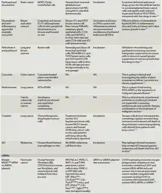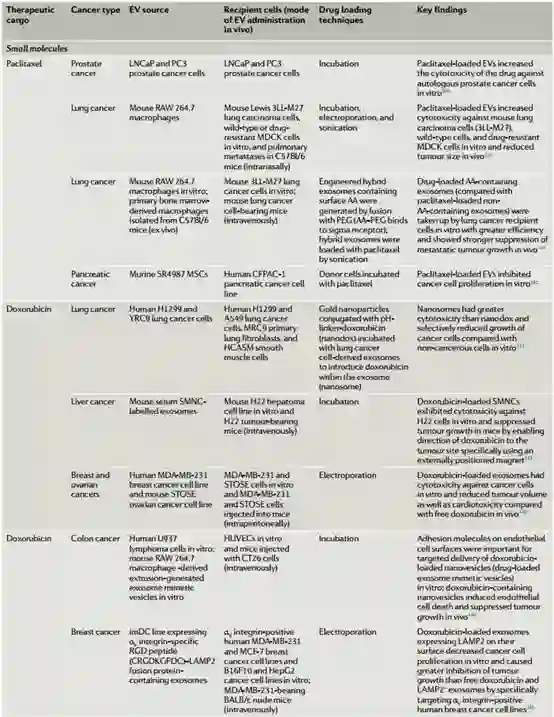 利用EVs作为药物载体用于癌症治疗又有哪些报道呢?继续看下表☟