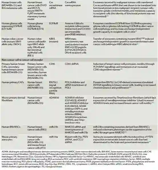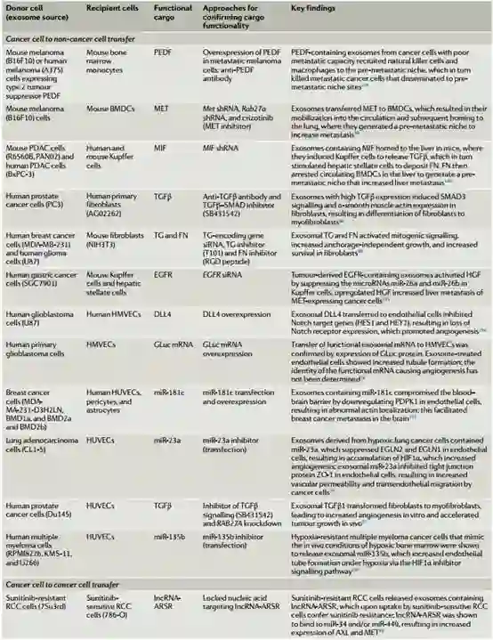 下表:证据支持外泌体成分在癌细胞通讯中发挥作用