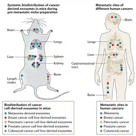 根据美国国家癌症研究所的数据,左图显示了小鼠体内来源于黑素瘤、乳腺癌、结肠直肠癌、胰腺癌和前列腺癌细胞分泌的外泌体的生物分布。右图显示了人体中这些癌症类型的常见转移部位。