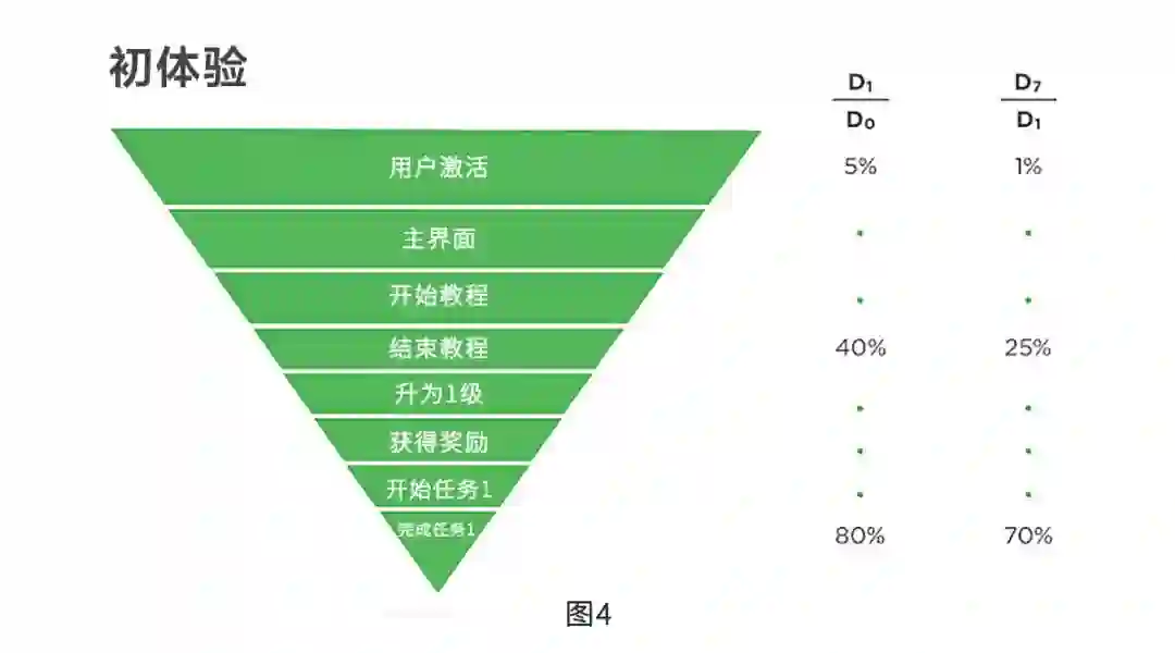 本例中,未登陆主界面的用户中,仅有5%会在次日(图3中的“第1天”)继续玩游戏,而完成教程的用户中,40%会在次日继续玩游戏,完成教程和任务1的用户中,80%会继续玩。这表明,游戏的产品团队应鼓励用户完成任务1。然而,若多数用户在教程阶段就不再玩游戏,仅有少部分人会完成任务1。此时,产品团队就应该特别注重教程前的用户体验,因为这一阶段流失了最多用户。