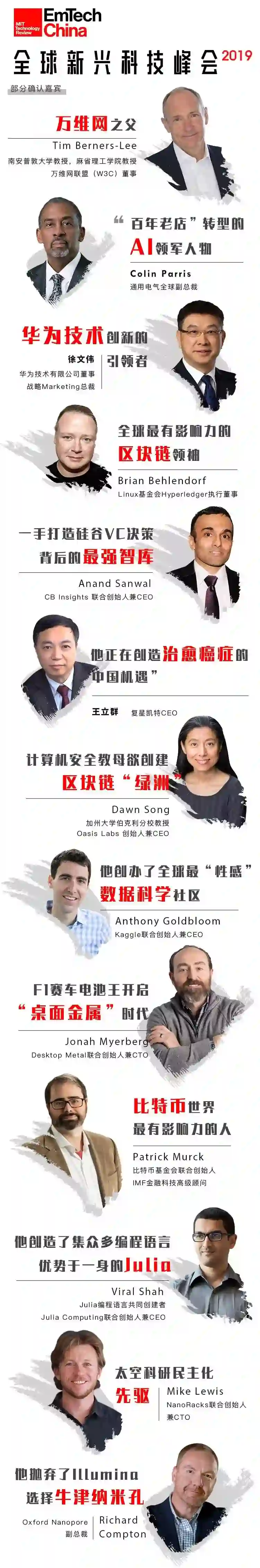在科技发展越来越超乎普通人想象的年代,我们迫切地需要一场巅峰对话来总结过去,指引未来。2019 年 1 月 19 - 21 日,EmTech China 全球新兴科技峰会,超过 30 位全球科技“掌舵人”将亲临北京,为你展开前沿技术的壮丽蓝图,为你解读技术背后的未来价值!