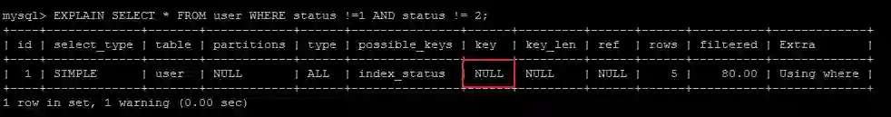 EXPLAIN SELECT * FROM user WHERE status !=1 AND status != 2;