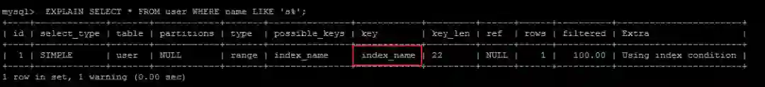EXPLAIN SELECT * FROM user WHERE name LIKE 's%';