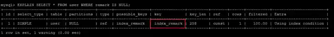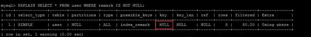 EXPLAIN SELECT * FROM user WHERE remark IS NULL;