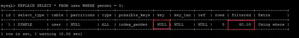 SELECT * FROM user WHERE gender = 0;没有命中索引,注意filtered的值就是上面我们计算的返回记录的比例数。