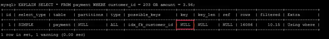 EXPLAIN SELECT * FROM payment WHERE customer_id = 203 OR amount = 3.96;