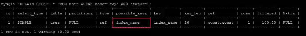 EXPLAIN SELECT * FROM user WHERE name='swj' AND status=1;